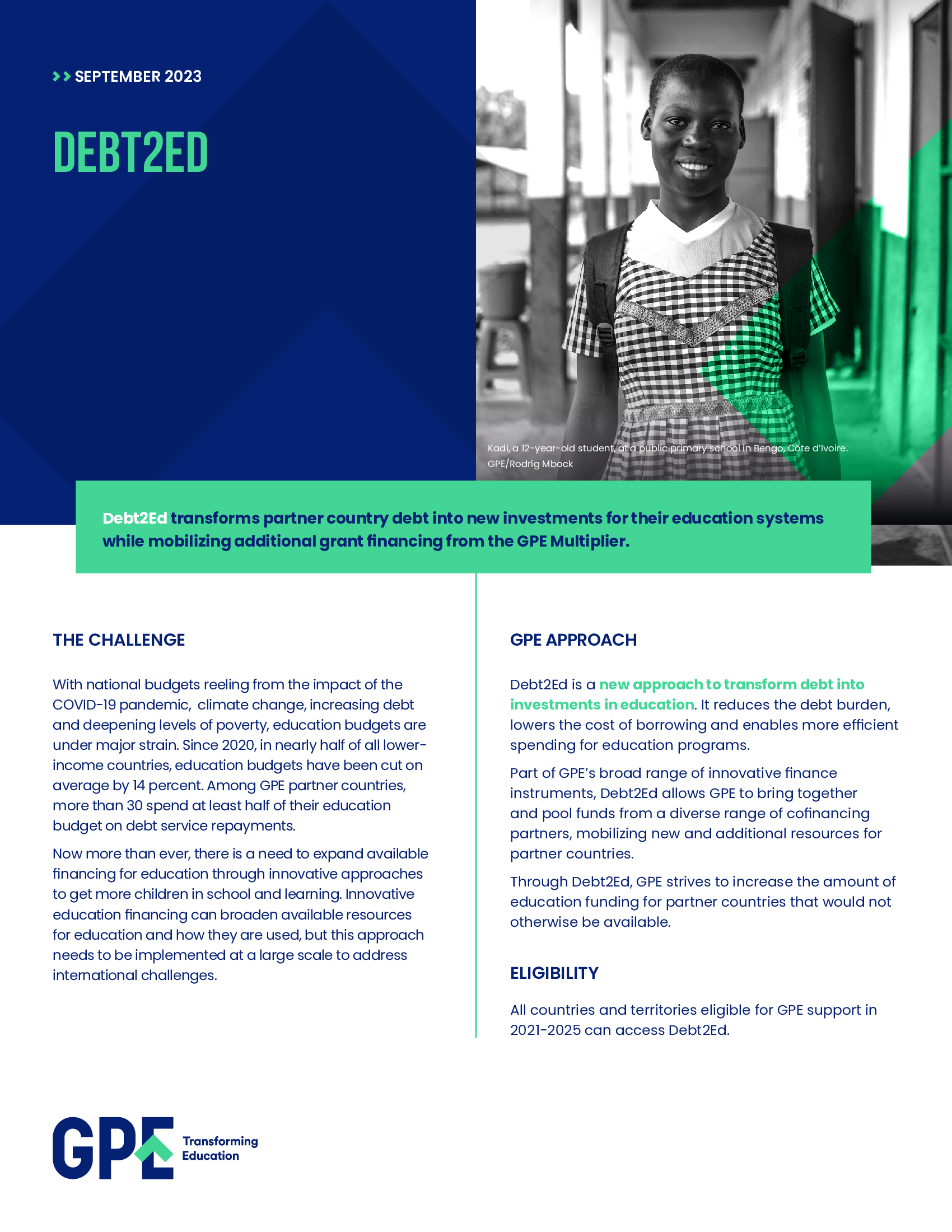 Debt2Ed transforms a partner country's debt repayment into new investments in education. Debt treatments can work either as a debt swap or as a loan buy-down. The Deb2Ed transaction unlocks additional funding from the GPE Multiplier, which increases the resources available for education in the partner country.